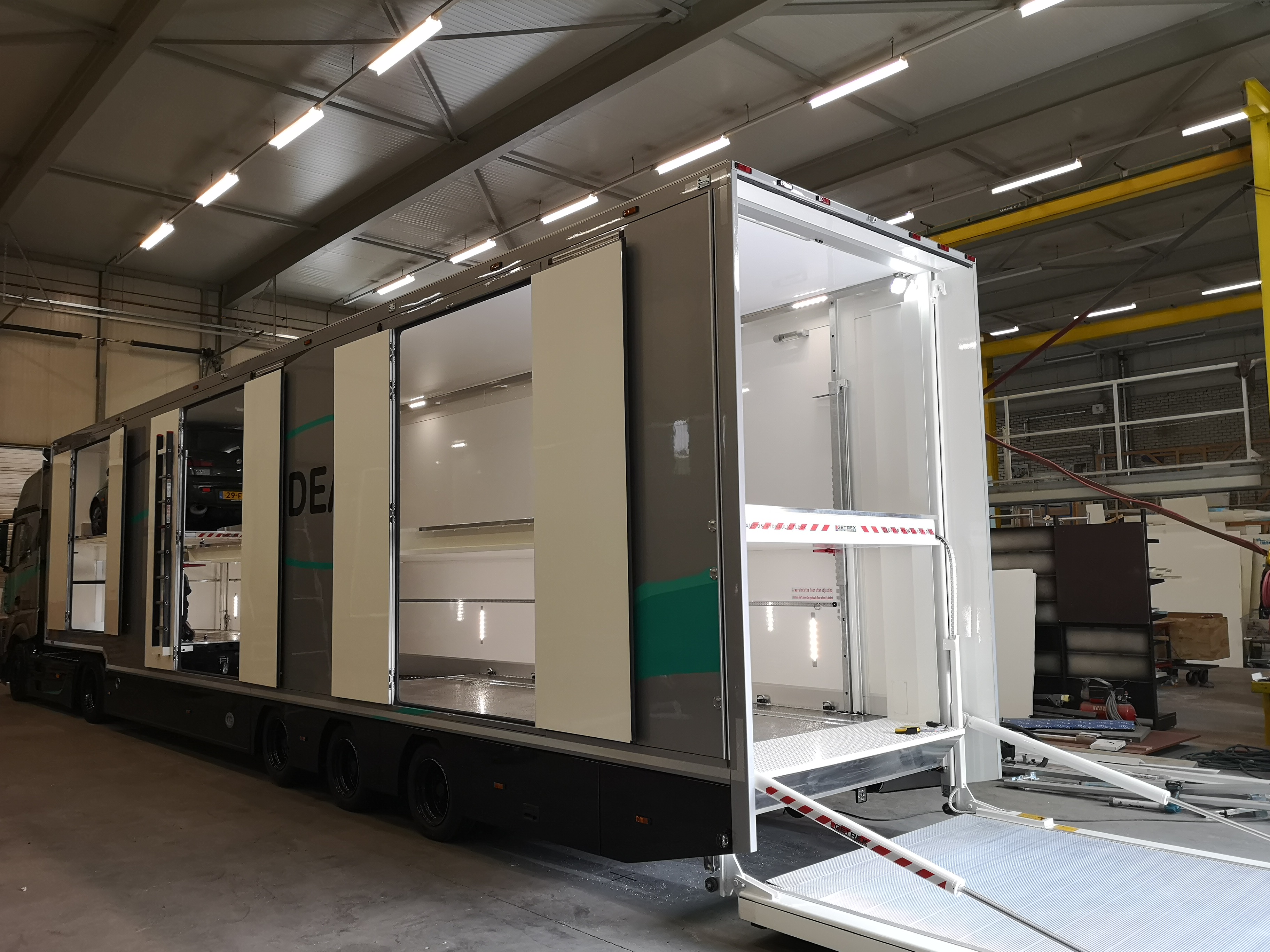 Deze speciale voertuigen zijn voorzien van 1 tot 5 hydraulische vloeren. De hydraulische vloeren kunnen zowel verticaal op en neer en onder een hoek, maar ook hydraulische horizontaal uitschuiven.